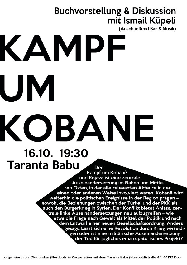 Im März diesen Jahres hat Ismail Küpeli bereits in der Oktopusbar zur Frage referiert, in wieweit sich der Antisemitismus in der Türkei aus dem Nationalismus speist. Diesmal stellt er seinen frisch im Münsteraner Verlag „edition assemblage“ erschienenen Sammelband zum Thema „Kampf um Kobane“ vor. Der Band beleuchtet den militärischen Konflikt in Kobane mittels Analysen von Autor_innen aus unterschiedlichen Backgrounds.