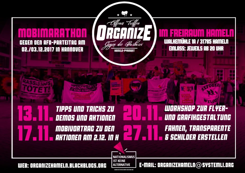 Die ersten vier Veranstaltungen dienen zur Mobilisierung gegen den AfD-Bundesparteitag am 2. und 3. Dezember 2017 in Hannover und sind nachfolgend kurz aufgelistet: