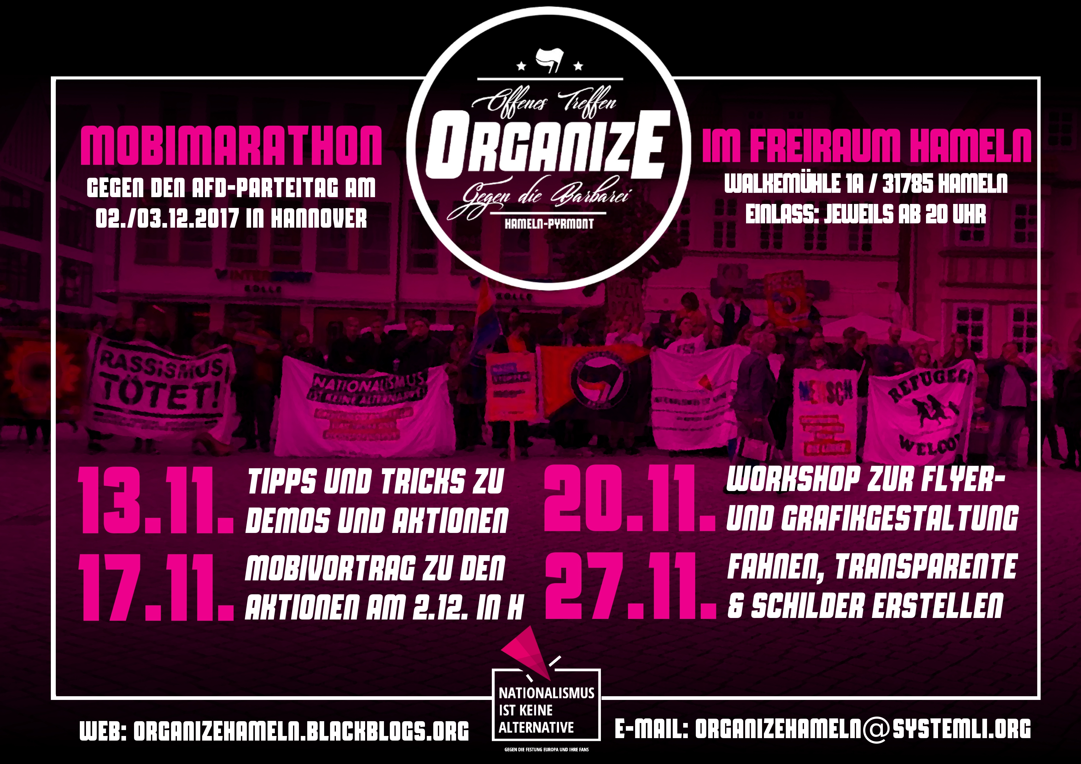 Im Freiraum Hameln (Walkemühle 1a, 31785 Hameln) finden im November 2017 die ersten vier Veranstaltungen des Offenen Treffens ORGANIZE Gegen die Barbarei! statt. Auf diesem Blog werden wir Euch darüber auf dem Laufenden halten. Als erstes hauen wir hierfür mal einen Flyer bzw. ein Poster raus. Weitere Informationen folgen so bald wie möglich.