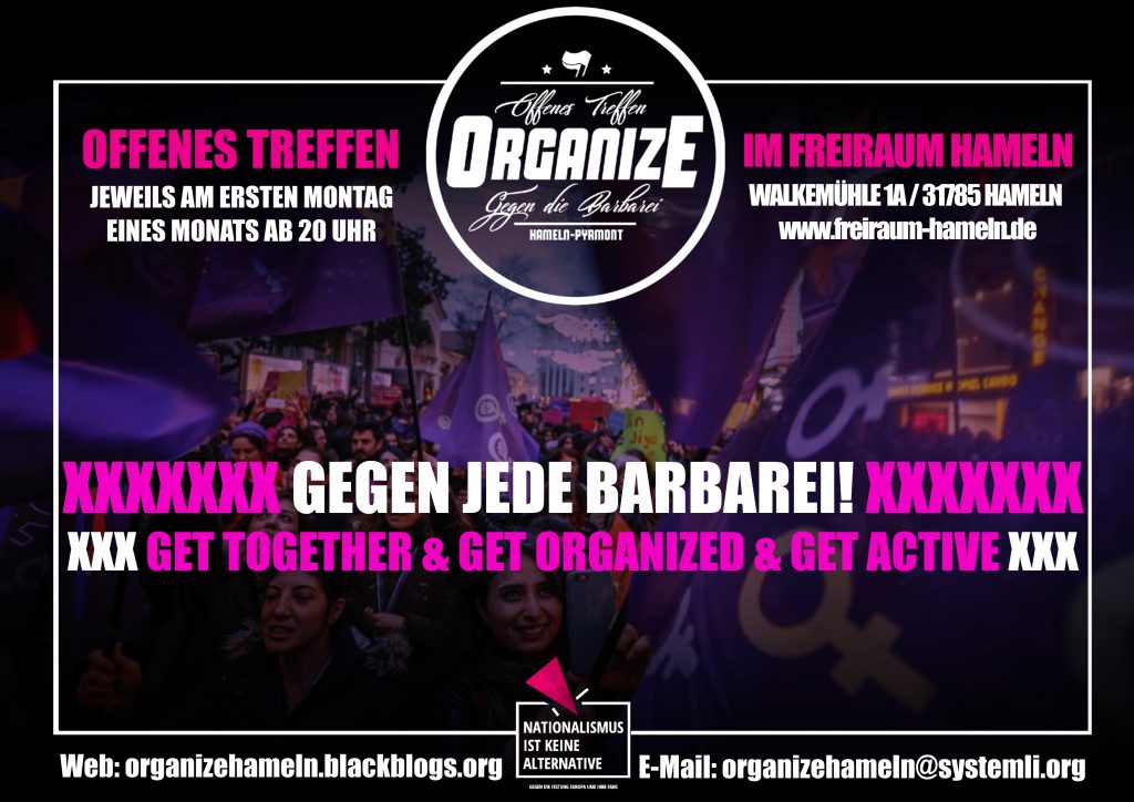 Ab Montag, den 2. September 2019, findet jeweils ab 20 Uhr am ersten Montag eines Monats das offene Treffen von Organize [HM] im freiraum Hameln (Walkemühle 1a, 31785 Hameln) statt. Das offene Treffen ist ein Anlaufpunkt für politisch interessierte Menschen aus Hameln und Umgebung. Die inhaltlichen Schwerpunkte ergeben sich dabei aus den Interessen der Anwesenden. Als verbindendes Element verstehen wir hierbei das gemeinsame Ziel einer Gesellschaft, in der jedes Individuum ohne Angst verschieden sein kann.