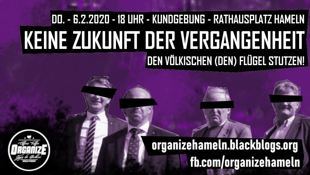 Am Donnerstag, den 6.2.2020, plant der Weserbergland-Ableger der Ü60-Fraktion der Höcke-Jugend eine Veranstaltung zur Vorstellung ihres Landratskandidaten im Hamelner Hotel Mercure. Neben dem (aller Voraussicht nach) ohnehin aussichtslosen Landratskandidaten Christopher Emden (von der AfD aus Oyten) wird auch der AfD-Bundessprecher Jörg Meuthen zu gegen sein. Da die bei vergangenen Aktionen zu hörende Forderung: „Skatepark statt Hotel Mercure“ bisher ungehört verhallte, wird es erneut notwendig sein, vor dem inoffiziellen Hauptquartier der völkischen Reaktion in Hameln zu protestieren. Daher rufen wir ab 18 Uhr zu einer Kundgebung auf dem Rathausplatz auf, um unsere Kritik an der Veranstaltung und ihren Organisator*innen zum Ausdruck zu bringen.