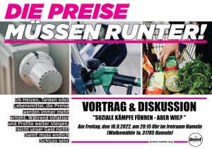 In mehreren Städten haben sich daher bereits Bündnisse gegen Preiserhöhungen gebildet. Gemeinsam wollen sie die Wut über die hohen Preise auch weiterhin in verschiedenen Aktionen auf die Straße bringen. Wir haben Aktive aus Bremen eingeladen, uns von ihren Erfahrungen zu berichten und würden uns freuen, wenn sich auch in Hameln Menschen zusammenfinden, die gemeinsam soziale Kämpfe führen wollen. Die Veranstaltung soll hierfür einen ersten Impuls geben.
