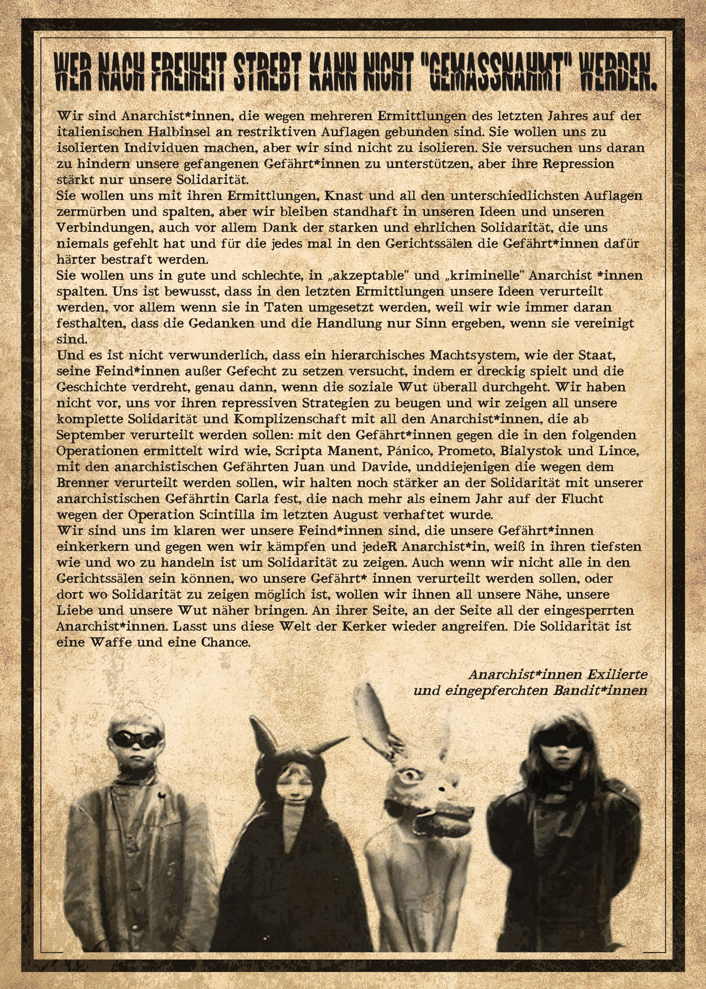 Und es nicht verwunderlich, das ein hierarchisches Machtsystem, wie der Staat seine Feind*innen außer Gefecht zu setzen versucht, indem er dreckig spielt und die Geschichte verdreht, genau dann, wenn die soziale Wut überall durchgeht. Wir haben nicht vor, uns vor ihren repressiven Strategien zu beugen und wir zeigen all unsere komplette Solidarität und Komplizenschaft mit all den Anarchist*innen, die ab September verurteilt werden sollen: mit den Gefährt*innen gegen die in den folgenden Operationen ermittelt wird wie, Scripta Manent, Pánico, Prometeo, Bialystok und Linke, mit den anarchistischen Gefährten Juan und Davide, und diejenigen die wegem Brenner-Prozess verurteilt werden sollen, wir halten noch stärker an der Solidarität mit unserer anarchistischen Gefährtin Carla fest, die nach mehr als einem Jahr auf der Flucht wegen der Operation Scintilla im letzten August verhaftet wurde.