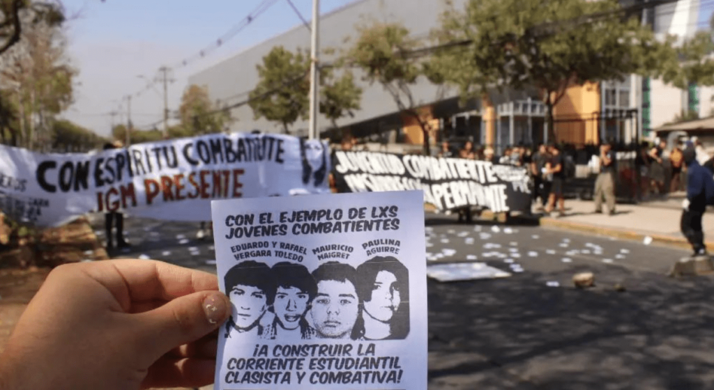 Banners were read: “Combatant youth, permanent insurrection. Vergara brothers present” and “With fighting spirit, JGM present”.