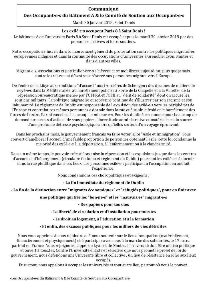Les Éxilé·e·s occupent Paris 8 Posted on 30/01/2018 by p8exilees Reply Les exilé.e.s occupent Paris 8!