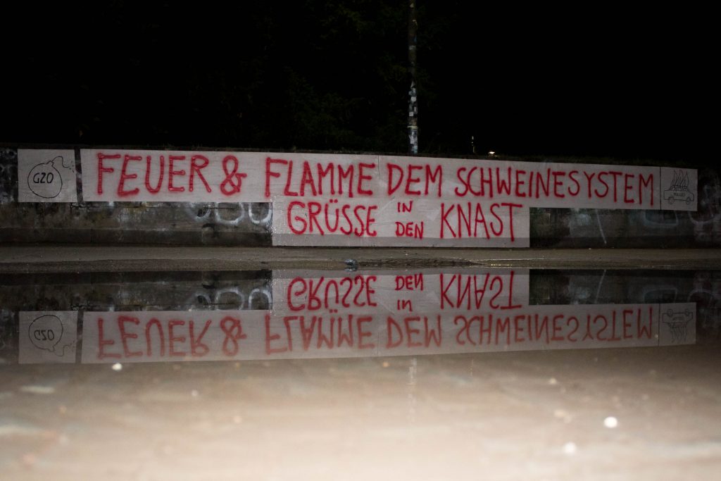 Dans la nuit du 7 au 8 juillet, les trois compagnon-ne-s se sont fait contrôler sur le banc d’un parc, puis ont été arrêté-e-s. Juste après, plusieurs domiciles ont été perquisitionnés à Hambourg, les portes et des meubles ont été détruits et plein de choses saisies sans qu’une liste de ces affaires ne soit présentée aux personnes présentes. Le lendemain, les flics publient un communiqué, dans lequel ils motivent le fait d’avoir embarqué les trois par le soupçon de préparation d’une infraction grave („présomption d’incendie volontaire“). Un jour après l’arrestation, les trois personnes concernées ont été présentées au JLD. Deux d’entre elles ont été envoyées en détention préventive. Le mandat de dépôt pour la troisième a été suspendu et elle est sortie sous contrôle judiciaire, avec interdiction de quitter la RFA. Le mandat d’arrêt n’a été que suspendu et pas levé. Pour des raisons stratégiques, la défense a annulé une demande d’appel de la détention qu’elle avait déposée. L’appel de la détention statue sur le maintien en prison préventive jusqu’au procès. Les audiences ne sont pas publiques.