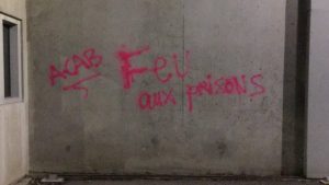 Nous avons marqué les murs de peinture, cassé plusieurs vitres des bâtiments administratifs, tiré des feux de bengale et fumigènes dans la cour de la prison et salué les prisonniers avec des feux d’artifices aux alentours de la prison. L’action a été sécurisée par des obstacles et des barricades enflammées.