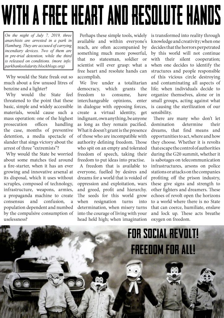 Poster in English in Solidarity with the 3 anarchists arrested in a park in Hamburg on July 2019