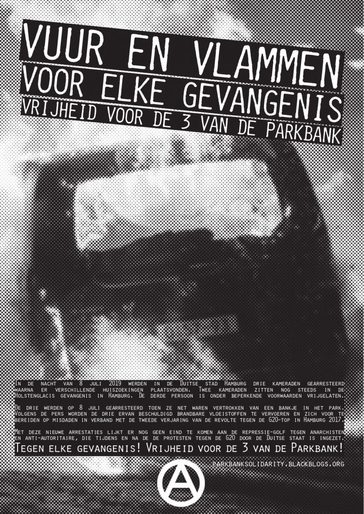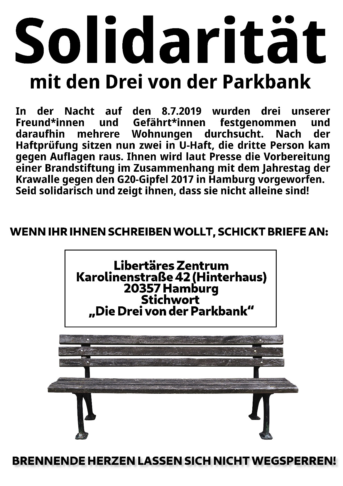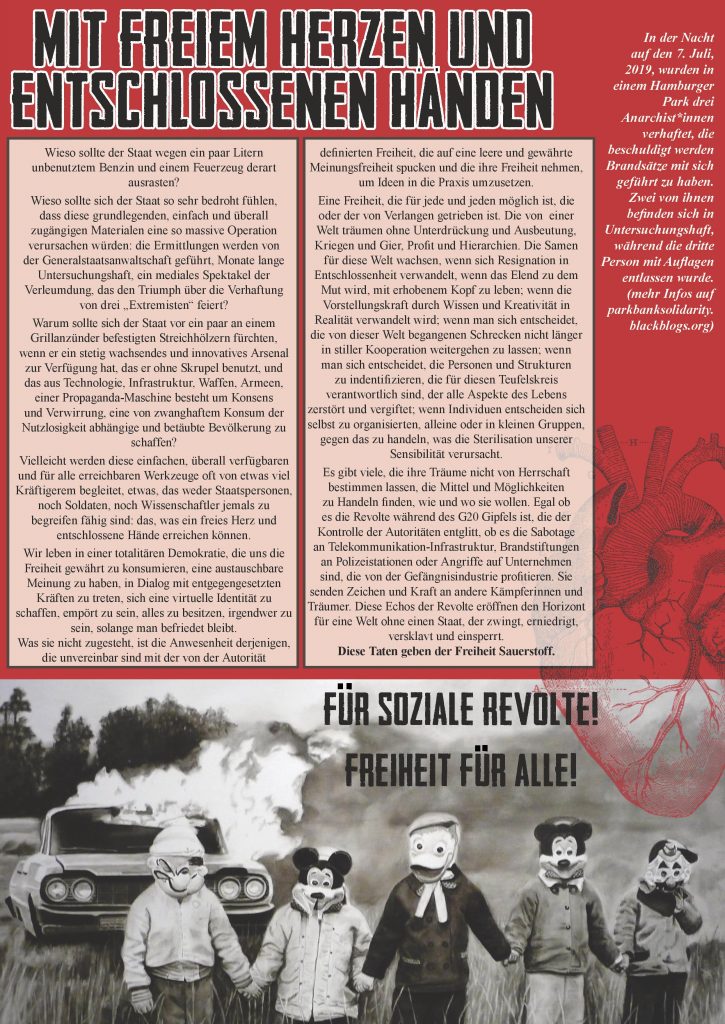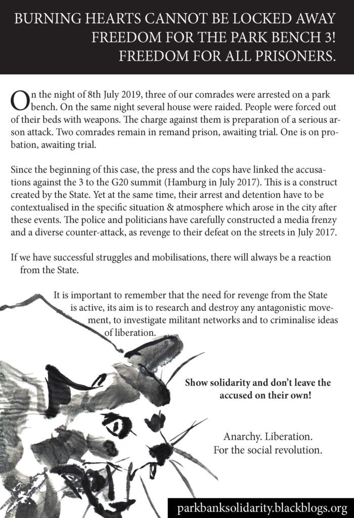 Poster in English in Solidarity with the 3 anarchists arrested in a park in Hamburg on July 2019