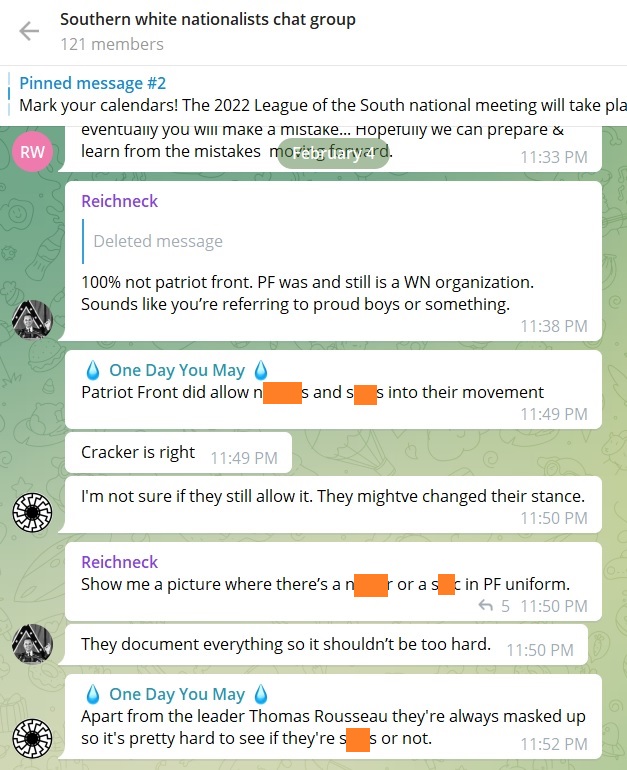On the Telegram messaging application, Goggins uses the name “Reichneck” –a reference to Hitler’s Third Reich. Goggins chose an image of segregationist politician and four-term governor of Alabama, George Wallace, as his profile picture. The “Reichneck” account is a member of the Telegram group for the White Lives Matter (WLM) racist network in Alabama. While Goggins does not seem particularly active in that network, in his leaked Patriot Front comments Goggins notified other Alabama PF members of an upcoming WLM rally. Goggins’ Telegram account is also a member of the “Southern white nationalists chat group”, which promotes and is closely tied to the white supremacist and Southern secessionist League of the South. In his comments to this chat, Goggins/“Reichneck” defended Patriot Front on February 4, 2021, insisting that Patriot Front was a true “WN [white nationalist] organization” and that nobody could find “a n[****]r or a s[**]c in PF uniform.”