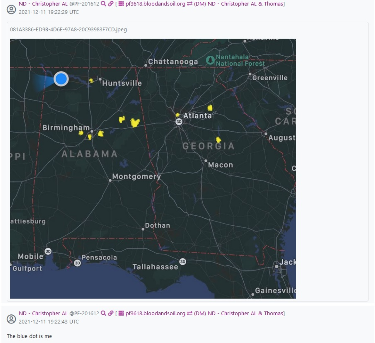 In January 2022, internal Patriot Front messages were leaked online by the Unicorn Riot media collective. In those messages, Network Director “Christopher AL” (Wesley Van Horn) provided the locations of every member of his Patriot Front network at the time. He also indicated that he lived in or near Lexington, AL.