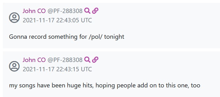 Oakes posted on Patriot Front’s internal chat as “John CO.” He indicates he frequented the /pol/ message board on 4Chan and wrote songs.