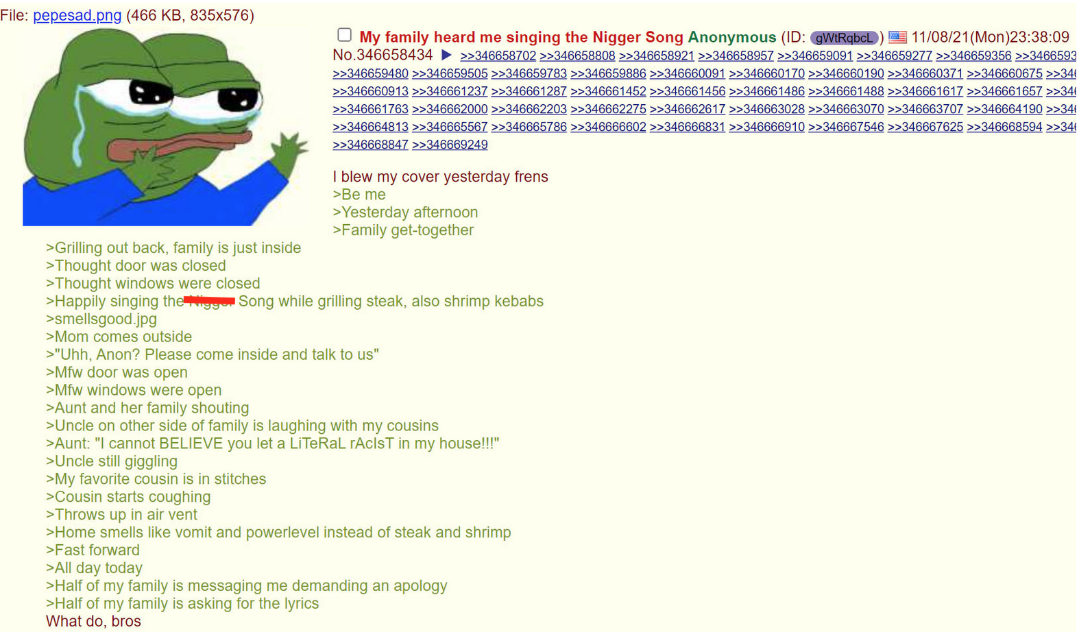 According to Dillon’s leaked chat messages, he was radicalized by the right-wing message board 4Chan, particularly its /pol/ board, which is also responsible for creating the QAnon conspiracy theory and numerous mass shooters. Dillon indicates that he is the author of a thread posted to /pol/ where he describes getting in trouble with his family for singing the “Ni***er Song,” and posts a recording of the song.