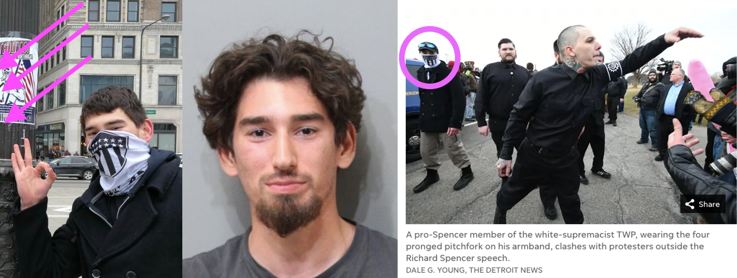 From left to right: Conor James Ryan in Chicago with Patriot Front propaganda, Mugshot from his arrest with Patriot Front in Idaho, Conor with the Nazis in the Traditionalist Workers Party outside of a Richard Spencer talk in Michigan.