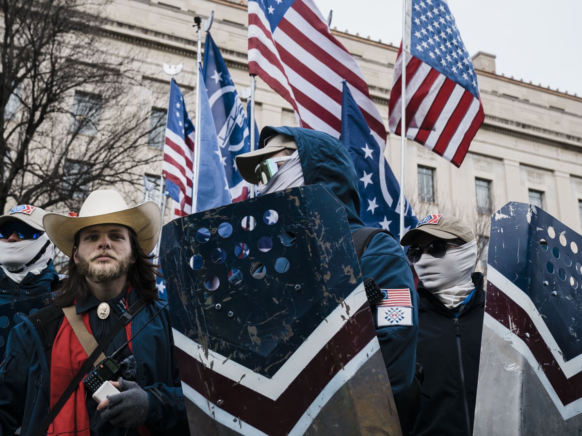 A NW7 member (identifiable by the “VII” patch) guarding Thomas Rousseau at PF’s March for Life demonstration on January 21, 2022 (photo by Kent Nishimura)