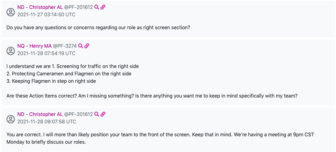 Brian Harwood discussing the logistics of his role as team leader in the right screen section with “Christopher AL”