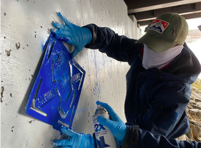 Brian Harwood putting up a Patriot Front stencil in Dover, New Hampshire