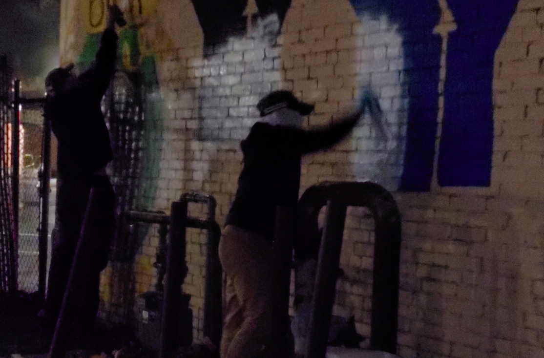 Brian Harwood (right) defacing a Black Lives Matter mural on the side of Champion Ice Cream Shop in Brockton, Massachusetts.
