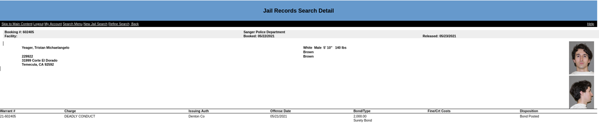 From there we discovered an arrest record for Tristan Michaelangelo Yeager out of Sanger, Texas in May 2021 for a charge of deadly conduct which gave us a mugshot to compare images to the leaked Patriot Front images of Michael TX. Yeager is also heavily involved in the Patriot Front tech team doing work on all of their servers.