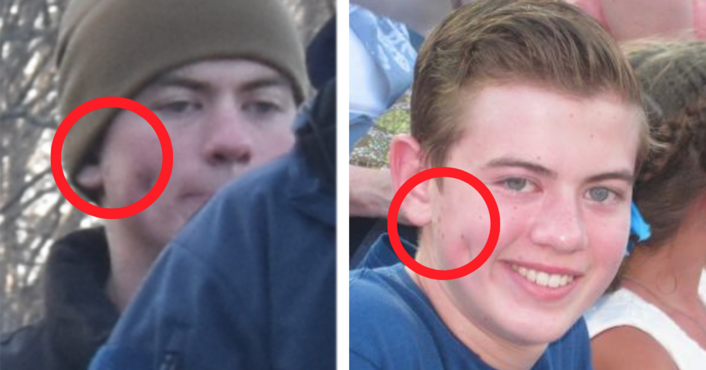 Images of Tyler Russell Arbuckle: image on left from leaked Patriot Front communications; image on right from a public post on Facebook clearly showing facial markings (image on right is from when he was younger).