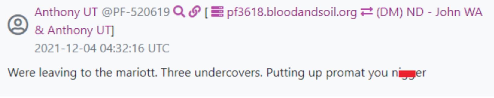 In late October of 2021, an anonymous source sent us a tip: the racist, neo-Nazi hate group known as “Patriot Front” had a new member in Utah. The source didn’t know the new guy’s real name, but they gave us the notes from his application interview in the hope that we’d be able to identify him. (You can read the full text of the interview notes at the end of this article.) After reading the notes, we knew a lot about the political views of applicant 462179, but didn’t have enough for a positive ID. When independent media outlet Unicorn Riot published PF’s leaked chat logs in January 2022, we searched for the applicant’s user number in the chats and learned he had chosen the moniker “James.” His chat logs gave us several more details about his personal life, so when he got arrested in Coeur d’Alene, Idaho in June 2022, we were easily able to connect Branden Mitchel Haney of Kaysville, UT with his pseudonym, “James UT.”