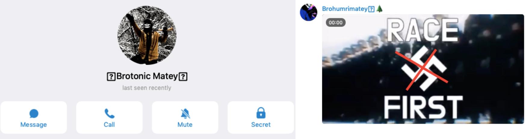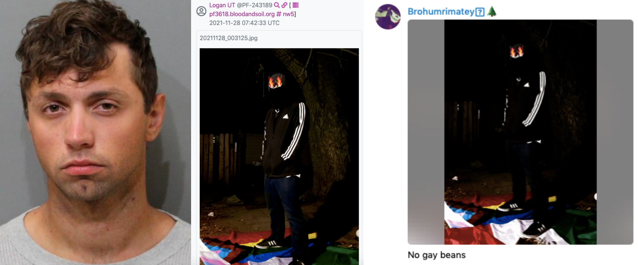 We can now confirm that Patriot Front member, Jared Michael Boyce (27), goes by “Logan UT” in the Patriot Front chats leaked by Unicorn Riot. In addition to that pseudonym, we know that Jared also uses “Brohumrie Matey” (or a similar variation) on Telegram, where he posts “anonymous” pictures of himself as well as a wide variety of Nazi propaganda. We matched these pseudonyms together because Jared posted the same photo of himself in the Patriot Front chats and on his Telegram. The picture shows him standing on stolen Pride/Mexico flags as a gesture of disrespect.
