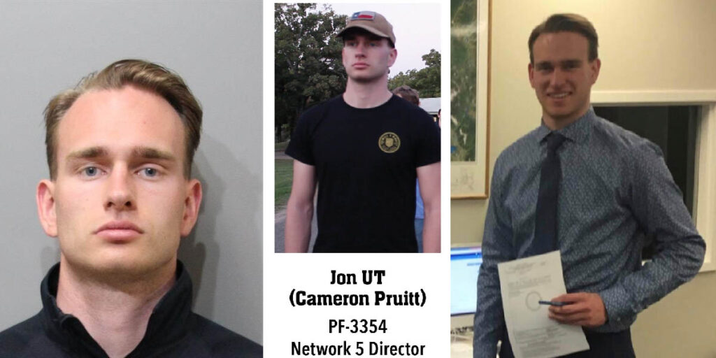 Cameron Kathan Pruitt, 23, of Midway UT was arrested alongside 30 other members of Patriot Front while attempting to disrupt a Pride event in Coeur d’Alene, Idaho. Pruitt was previously arrested in 2020 for putting up Patriot Front stickers in Weatherford, TX with Graham Whitson and Thoas Rousseau. Joshua serves in Patriot Front leadership as Network 5 Director.