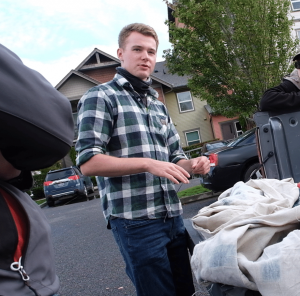 Colton Michael Brown preparing a banner for a drop in Kitsap County.