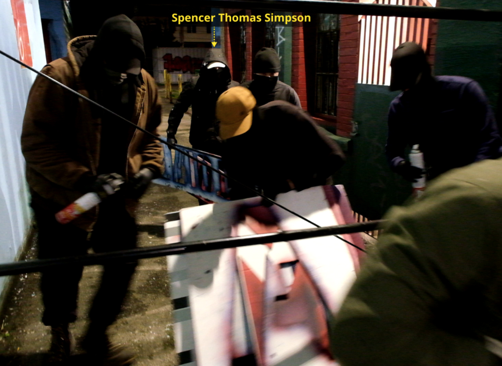 On Saturday, October 16th, members of Patriot Front vandalized a “Respect & Love Olympia” mural, covering it with white paint before stenciling over it with their nationalist slogan and links to their Nazi website. This effort involved weeks of planning with members from across the entire Pacific Northwest contingent of Patriot Front, as well as with knowledge and assistance from Thomas Rousseau. Spencer Simpson was present and involved in this action..