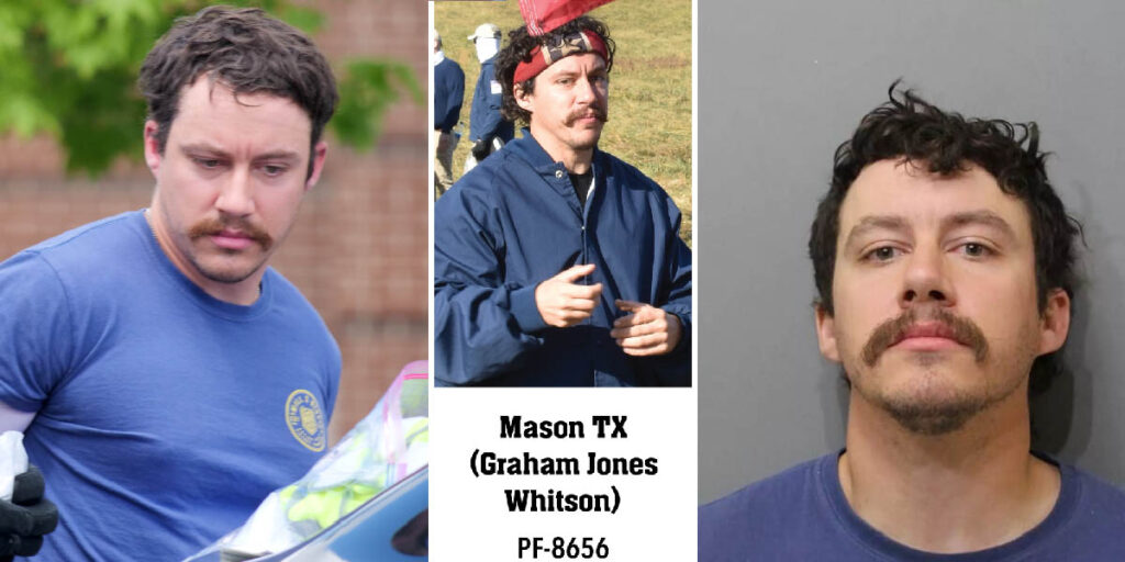 Graham Jones Whitson, 31, of Haslet TX was arrested alongside 30 other members of Patriot Front while attempting to disrupt a Pride event in Coeur d’Alene, Idaho. Whitson was previously arrested in 2020 for putting up Patriot Front stickers in Weatherford, TX with Cameron Pruitt and Thomas Rousseau.