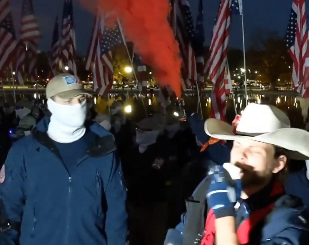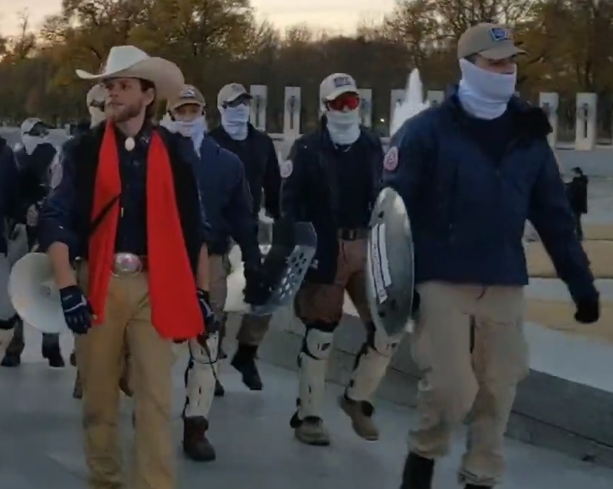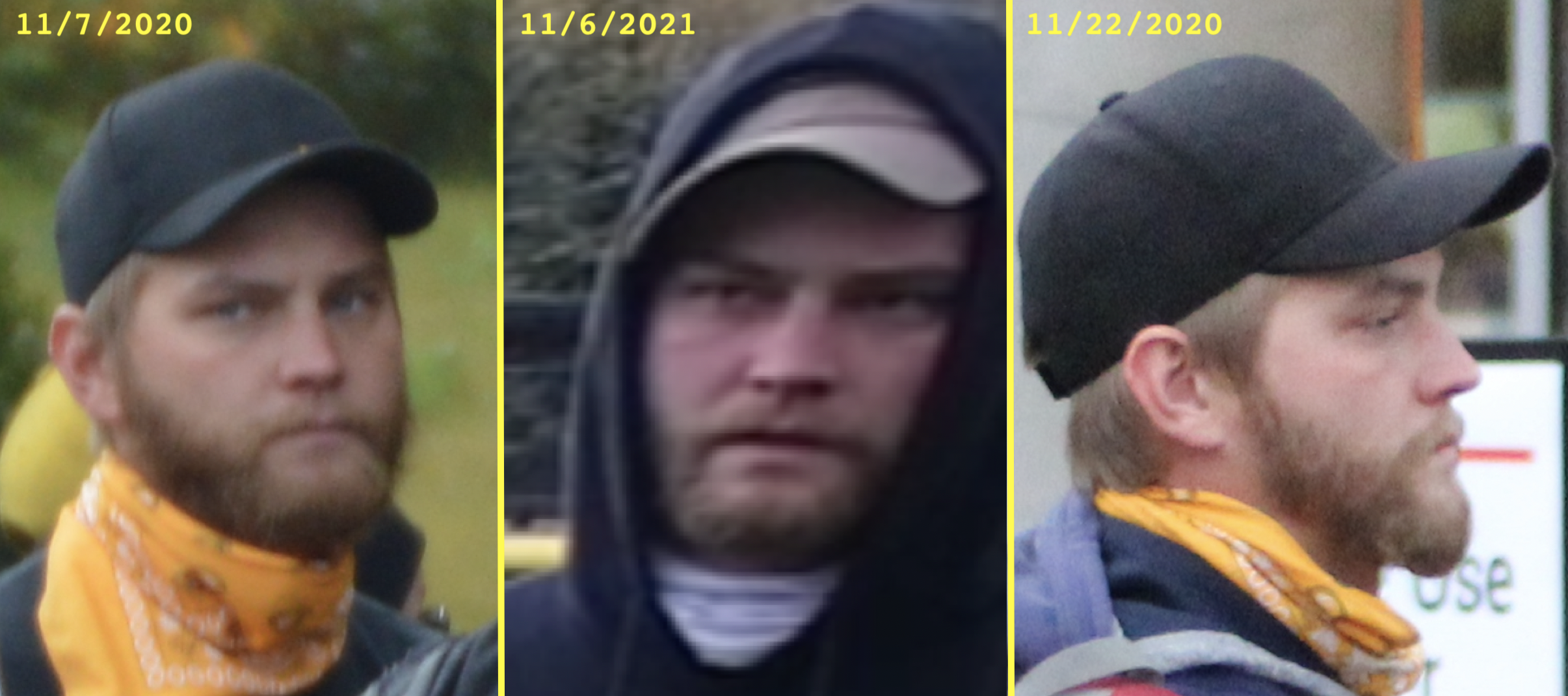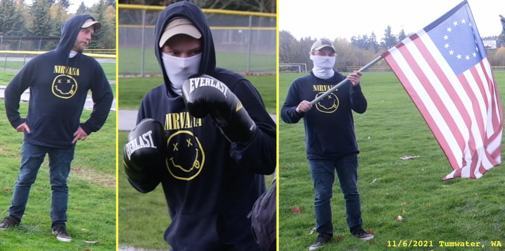 Lawrence has made appearances at Patriot Front’s events in the Pacific Northwest. He notably helped the group during their defacement of the aforementioned Black Lives Matter mural in Olympia, Washington. He (and his stupid fucking manbun) can be seen in the following stills taken from videos recorded during a practice session and during the vandalism itself.