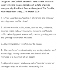 Until 22nd March two more persons tested positive. One of them died on the way to the hospital on 20th March. On 27th of March a state of public emergency was declared by President Barrow throughout The Gambia.