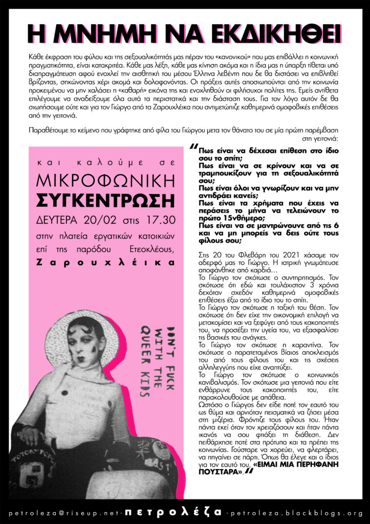 Για κάθε γυναίκα που βιώνει την σεξιστική έμφυλη βία στον δρόμο, στο σπίτι, στις σχέσεις τους, στο σχολείο στην δουλειά. Για την 14χρονη αδερφή μας εδώ στην Πάτρα, που καταγγέλει τον προπονητή της για σεξουαλική επίθεση, για την 40χρονη αδερφή μας από την Αργυρούπολη, που παλεύει στο νοσοκομείο για την ζωή της από τον ξυλοδαρμό που δέχτηκε, για την αδερφή μας στην Θεσσαλονίκη που καταδεικνύει τους άντρες που την βίασαν, για την Νεκταρία, την Ελόνα, την Τζεβριέ και τόσες άλλες αδερφές μας που δεν είναι πια εδώ, εμείς θα γεμίζουμε με λύσσα και οργή μέχρι να σπάσει το οικοδόμημα που λέγεται πατριαρχία.