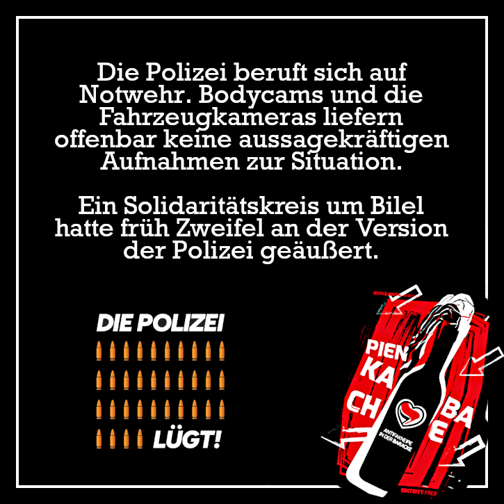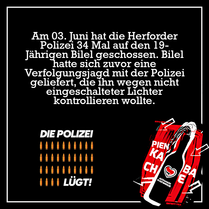 34 Schüsse hat die Polizei am 3. Juni 2023 auf Bilel aus Herford abgegeben. Sechs Mal hat sie den 19-Jährigen getroffen, ihn schwer verletzt, nun ist er querschnittsgelähmt. Die Polizei behauptet, Bilel sei ohne Licht im Auto unterwegs gewesen und beruft sich auf Notwehr. Bodycams und Fahrzeugkameras waren offenbar nicht eingeschaltet, gegen die beteiligten Polizist*innen wird ermittelt. Schon früh hatte der Solidaritätskreis Bilel Zweifel an der offiziellen Version öffentlich gemacht und den Verdacht geäußert, dass es sich um rassistische Polizeigewalt handelt.