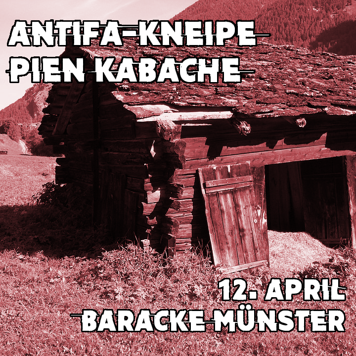Am 12. April veranstalten wir wieder unsere monatliche Antifakneipe in der Baracke. Günstige Getränke, Zeit zum Abhängen und gemütlich das Wochenende einleiten. Kommt vorbei!