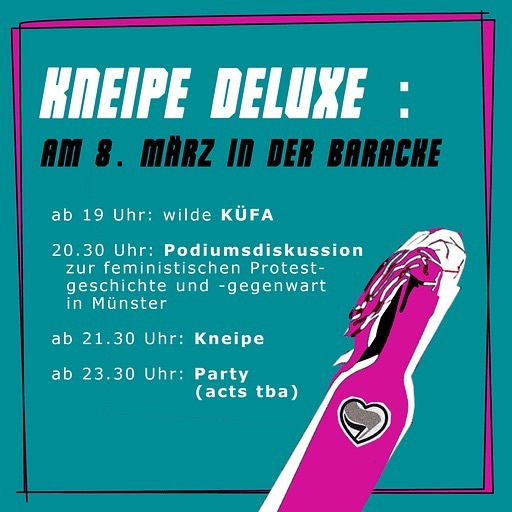 Ab 19 Uhr öffnen wir die Tore der @baracke.ms und die wundervolle @diewildekuefa wird nicht nur eure Mägen, sondern auch eure Herzen erwärmen. Nachdem wir alle gestärkt sind, möchten wir mit euch einen Blick in die feministische Protestgeschichte Münsters wagen. Dafür haben wir 3 Stargäste aus dem lokalen feministischen Kontext zu einem Podiumsgespräch geladen. Gemeinsam mit unseren Gästen – und natürlich mit euch – wollen wir diskutieren: Was können wir von vergangenen feministischen Kämpfen, von Erfolgsmomenten aber auch von Herausforderungen für heute lernen? Damit ihr eure Stimmen nach dem vielen Debattieren wieder ölen könnt, sorgen wir bei der anschließenden Kneipe für ausreichend Bier und Purple Rain – der Cocktail des Abends 💜 Natürlich wollen wir auch das Tanzbein mit euch schwingen und eröffnen deshalb ab Mitternacht den Dancefloor.