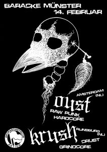 OUST aus Amsterdam sind unterwegs. Krachiger Hardcore trifft auf rauen verzerrten Punk. Ballert alles weg! Auch aus den Niederlanden kommen Kru$h. Gegründet 1996 spielen sie eine Mischung aus Oldschool Crust und Grindcore. Top! Anschließend gibt es den regulären Kneipenabend.