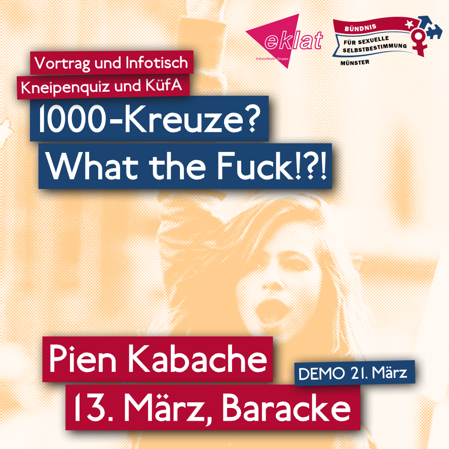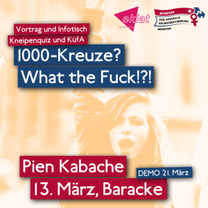 Nach einer gefühlten Ewigkeit können wir mit unserem Kneipenabend endlich wieder starten.13.3. 1000-Kreuze? What The Fuck!?! Info- und Solitresen zu den feministischen Protesten am 20. & 21.3. in Münster