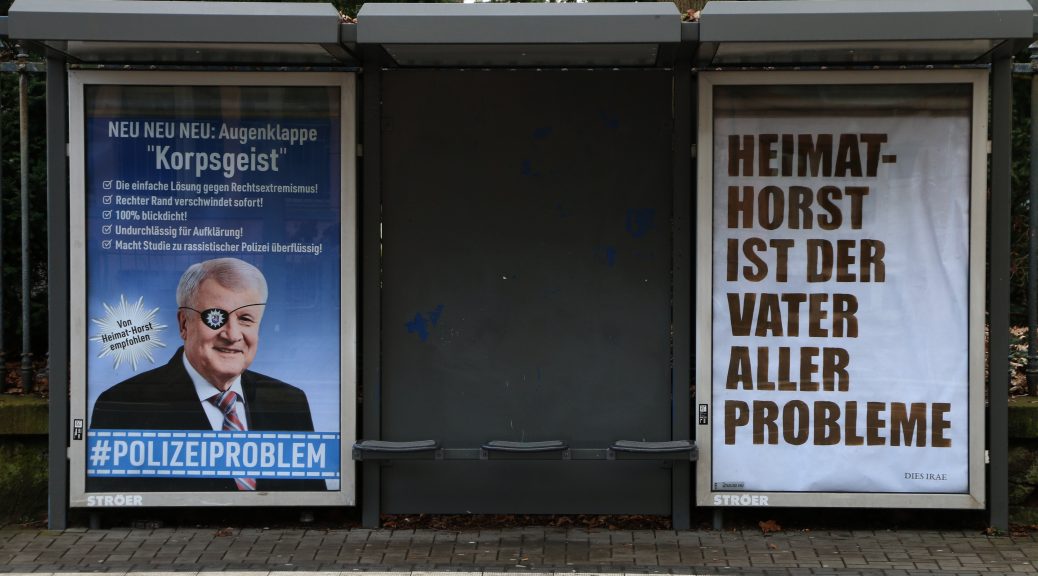 Das Plakatkunst-Kollektiv „DIES IRAE“ platzierte unerlaubt bundesweit über 500 Plakate in Werbevitrinen, die Horst Seehofer mit einer Augenklappe auf dem rechten Auge blind darstellen. Die Polizei ermittelt wegen „Verunglimpfung der Regierung“. Bereits 2020 war das von Seehofer geleitete Innenministerium in den Nachrichten, weil der Verfassungsschutz und das „Gemeinsame Extremismus- und Terrorismusabwehrzentrum“ (GETZ) statt Terror lieber von Linken umgestaltete Werbeplakate verfolgten. Seda Başay-Yıldız, Rechtsanwältin aus Frankfurt und Jörg Schindler, Bundesgeschäftsführer der Partei DIE LINKE solidarisieren sich mit den Betroffenen. „Die neue Innenministerin Nancy Faeser steht in der Verantwortung, diese Posse zu beenden!“ sagt DIES IRAE.