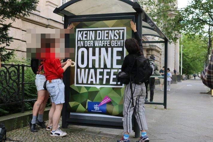 Die Berliner Polizei hatte 2019 wegen beklebter und bemalter Werbeposter der Bundeswehr Hausdurchschuchungen und DNA-Analysen veranstaltet, weil diese die Bundeswehr „gar lächerlich“ machen. Gegen diese willkürliche Kriminalisierung wehrte sich 2020 eine Betroffene. „Am Donnerstag ließt das Bundesverfassungsgericht der Berliner Polizei hoffentlich ordentlich die Leviten!“ freut sich Klaus Poster, Sprecher*in der Soligruppe plakativ.