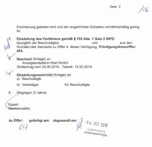 Doch der Einstellungsbeschluss 231/Js1812/19 vom 3.12.2019 stellt klar, dass die Staatsanwaltschaft im Gesehen keinen Schweren Diebstahl erkennen kann: „Strafrechtlich ist der Sachverhalt vom 13.05.2019 wie folgt zu bewerten: Eine Strafbarkeit gemäß§ 243 Abs. 1 Nr. 1 oder Nr. 2 StGB kommt nicht in Betracht: Zum einen ist die Anwendbarkeit wegen Abs. 2 StGB fraglich. Zum anderen käme hier nur Versuch in Betracht. Da aber aus anderen Fällen des sog. Adbusting bekannt ist, dass die ursprünglichen Plakate nicht immer mitgenommen, sondern teilweise auch in dem Werbekasten belassen werden, kann hier nicht unterstellt werden, dass die Beschuldigten das ursprüngliche Plakat mitnehmen wollten.“ Folgerichtig erfolgte die Einstellung wegen Geringfügigkeit (§153 StPO, Staatsanwältin Eppert, 231/Js1812/19).