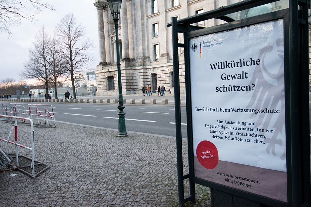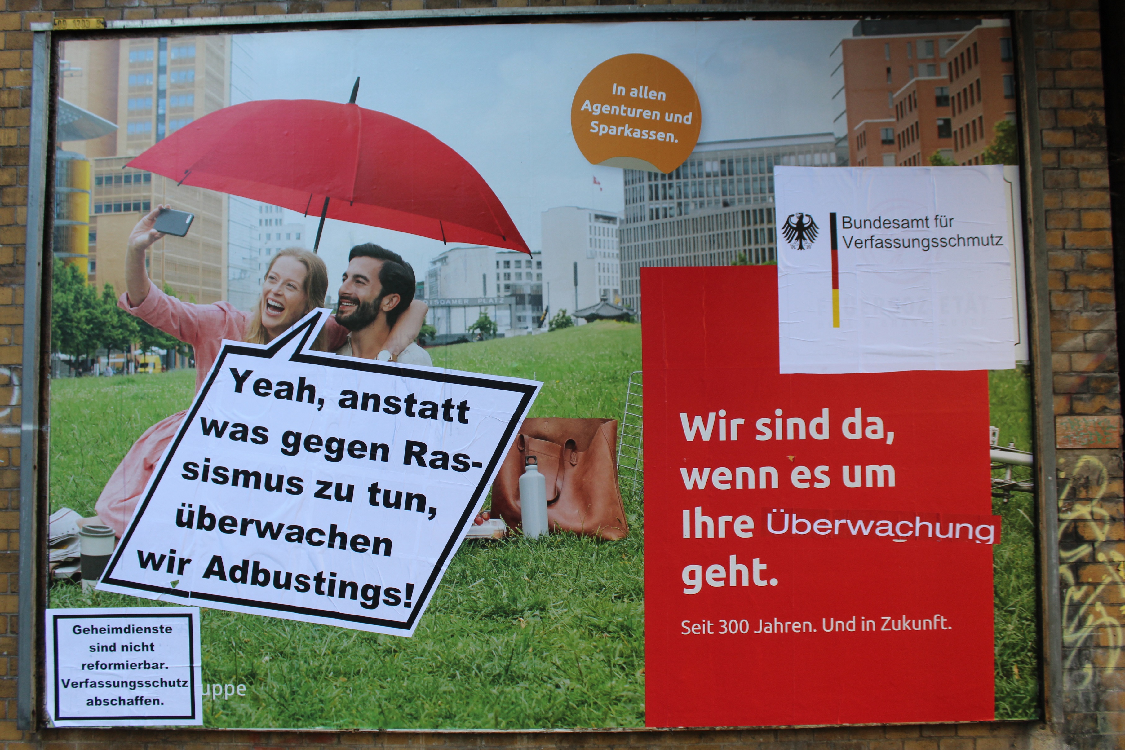 Am Donnerstag, den 9. Juli 2020 werden Heimatschutzminister Seehofer und Geheimdienstchef Haldenwang den sogenannten „Verfassungsschutzbericht 2019“ der Öffentlichkeit präsentieren. Im letzten Verfassungsbericht hatte der Geheimdienst die Aktionsform des Adbustings mit einer halben Seite und einem schönen Farbfoto geehrt. Dafür revanchierte die Kommunikationsguerilla-Szene sich bundesweit mit vielen Adbusting-Aktionen.