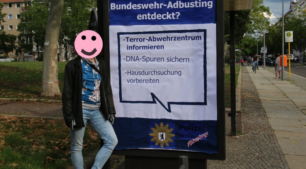 Drei Hausdurchsuchungen wegen eines (!) veränderten Bundeswehrposters? In Berlin völlig normal, wie der Fall aus dem September 2019 zeigt. Gegen die Durchsuchungsbeschlüsse hatte die Soligruppe plakativ beim Landgericht Berlin Beschwerde eingelegt. Diese wurde nun „als unbegründet verworfen“. Daher zieht die Soligruppe jetzt mit Unterstützung der Rechtswissenschaftler Mohammad El-Ghazi (Trier) und Andreas Fischer-Lescano (Bremen) vor das Bundesverfassungsgericht. „Recht bekommt man nicht einfach so, Recht muss man sich nehmen“, kommentiert Klaus Poster diesen Schritt. Continue reading Hausdurchsuchungen wegen Adbustings: Berliner LKA wiegt sich (noch) in Sicherheit