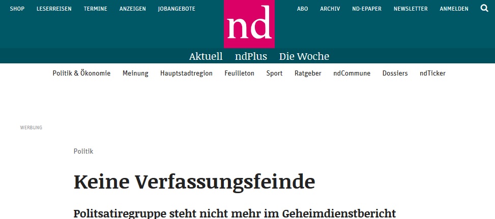Das nd berichtet online und gedruckt darüber, dass Adbusting nicht mehr im sogenannten „Verfassungsschutzbericht“ des Geheimdienstes „Bundesamt für Verfassungsschutz“ zu finden ist und führt diese Veränderung auf unsere Öffentlichkeitsarbeit zurück. Vielen Dank für die Props.