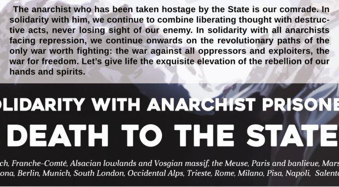 The anarchist who has been taken hostage by the State is our comrade. In solidarity with him, we continue to combine liberating thought with destructive acts, never losing sight of our enemy. In solidarity with all anarchists facing repression, we continue onwards on the revolutionary paths of the only war worth fighting: the war against all oppressors and exploiters, the war for freedom. Let’s give life the exquisite elevation of the rebellion of our hands and spirits.