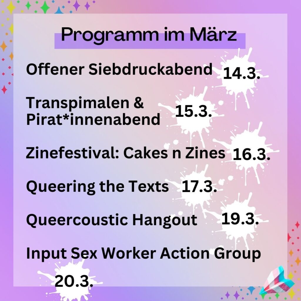 Hey, hier bist du auf der Programmseite für die Aktionen im März 2024 gelandet! Wir haben unterschiedliche Events rund um Sichtbarkeit, Aufklärung und Empowerment geplant <3