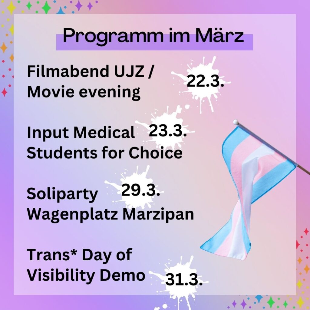 Zuerst wollen wir gemeinsam ein großes Banner für den Trans* Day of Visibility am 31.03. malen und uns dabei gemeinsam über unsere Wünsche, Ideen & Vorstellungen für den Tag austauschen. Danach werden wir eine queere Piratenserie (Komödie) schauen. Es wird auch alkoholfreie Cocktails, Kicker und Lagerfeuer geben.