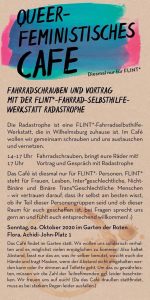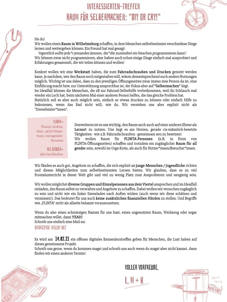 Wir wollen auf eine tolle Idee aufmerksam machen, bei der auch zwei von uns mitwirken. Ein Ort fĂĽr Selbermachen in Wilhelmsburg. All gender organisiert, aber mit FLINTA-Fokus! <3