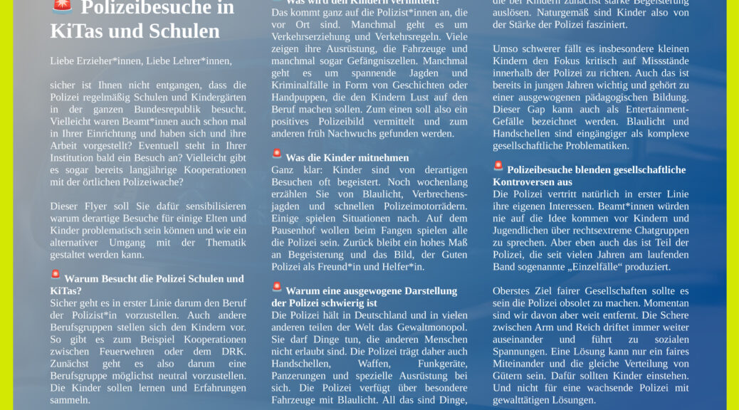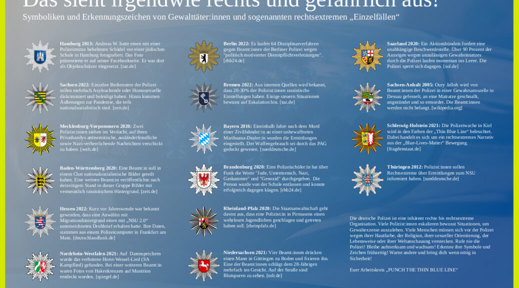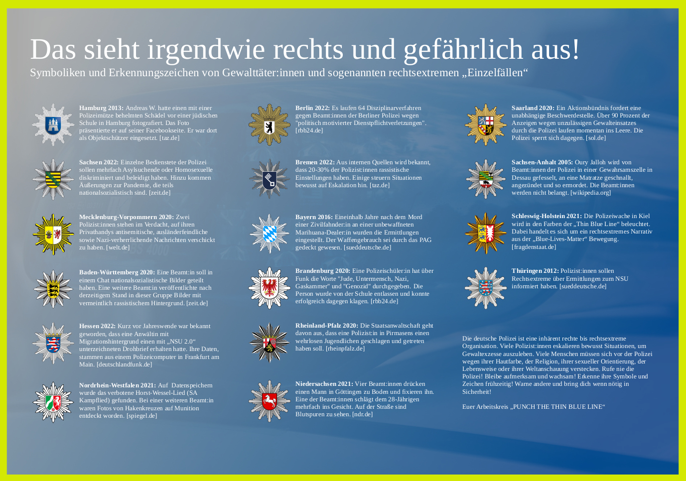 Die deutsche Polizei ist eine inhärent rechte bis rechtsextreme Organisation. Viele Polizist:innen eskalieren bewusst Situationen, um Gewaltexzesse auszuleben. Viele Menschen müssen sich vor der Polizei wegen ihrer Hautfarbe, der Religion, ihrer sexueller Orientierung, der Lebensweise oder ihrer Weltanschauung verstecken. Rufe nie die Polizei! Bleibe aufmerksam und wachsam! Erkenne ihre Symbole und Zeichen frühzeitig! Warne andere und bring dich wenn nötig in Sicherheit!