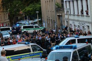 Um 19 Uhr zog die Demo schließlich los – selbst nach Polizeiangaben mit 700 Leuten! Es ging durch die historische Innenstadt von Halle, als erstes auf den Campus der Martin-Luther-Universität in Halle. Dort ist die Burschenschaft “Halle-Leobener Germania” ansässig – welche enge Kontakte zur IB pflegt. Ebenso wie in Dresden und Berlin stützt sich die IB hier direkt auf vorhandene Strukturen und Kader der Burschenschaften zum Aufbau und zur Rekrutierung. Außerdem soll so eine gewisse gesellschaftliche Verankerung erreicht werden. Und bei der Kundgebung auf Campus war das erste Mal richtig zu erkennen, wie viele Personen vor Ort waren. Anschließend zog die Demo zum IB-Haus in der Adam-Kuckhoff-Straße 16. Dort wurde sie von einem Häufchen Identitärer und sie unterstützenden Personen hinter der Polizeiabsperrung erwartet. Geben wir ihnen 50 Leute, die zudem teilweise aus Österreich angereist waren. Eine große Mobilisierung bekommt die IB auf lokaler Ebene also definitiv nicht hin.